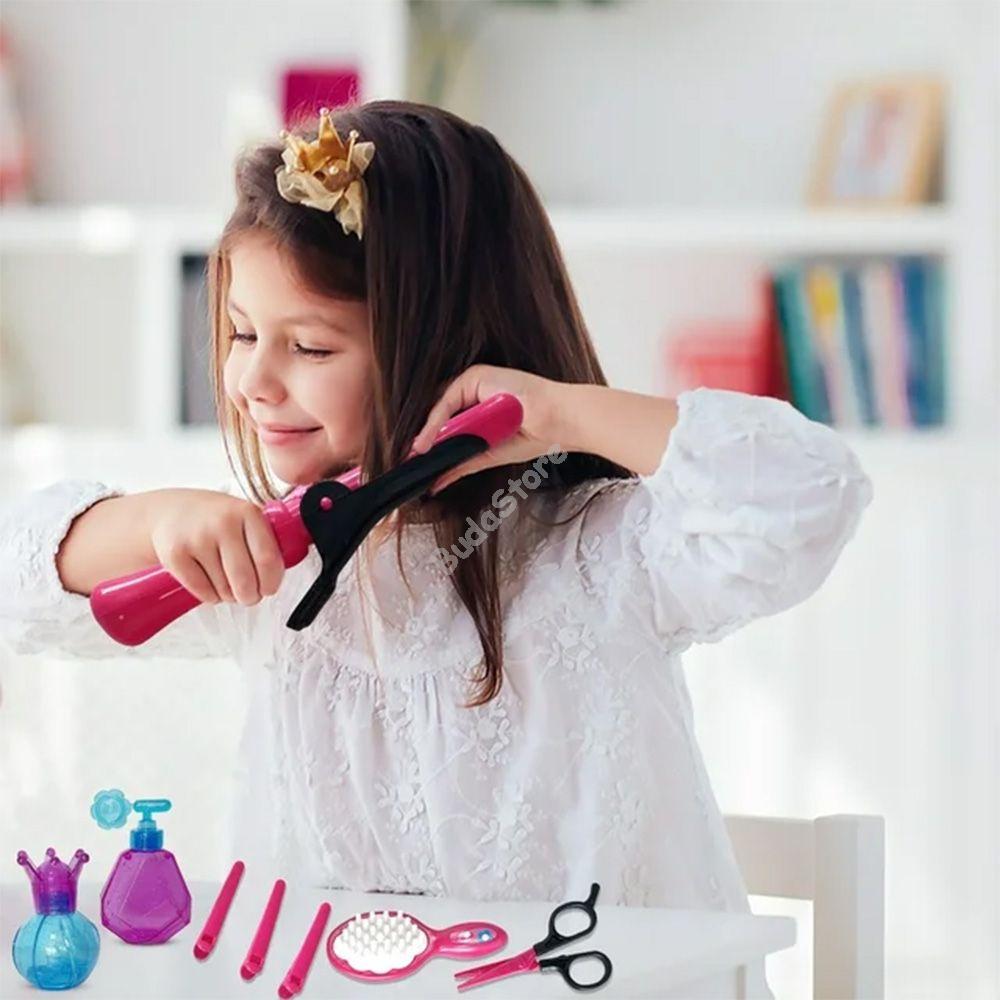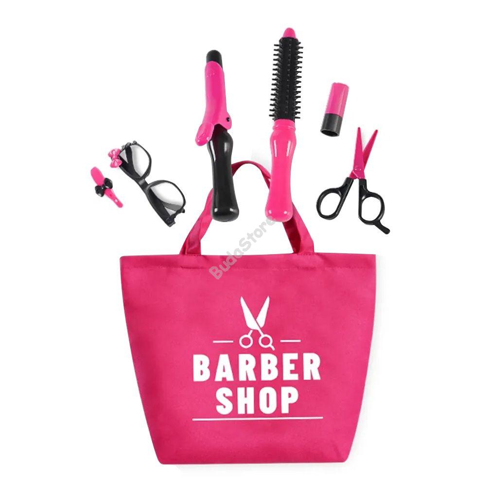 A készlet tartalmaz játék hajszárítót, csipeszeket és játék ollót mellyel a kicsik beleképzelhetik magukat a szalonok világába és stílusos frizurákat készíthetnek.A hajcsatok és hajcsipeszek segítenek a különféle frizurák kialakításában. A tükör segítségével bármikor ellenőrizhetik, hogyan haladnak a legújabb frizurával. Praktikus, vállra akasztható textil táskában a kicsik bárhová magukkal vihetik.