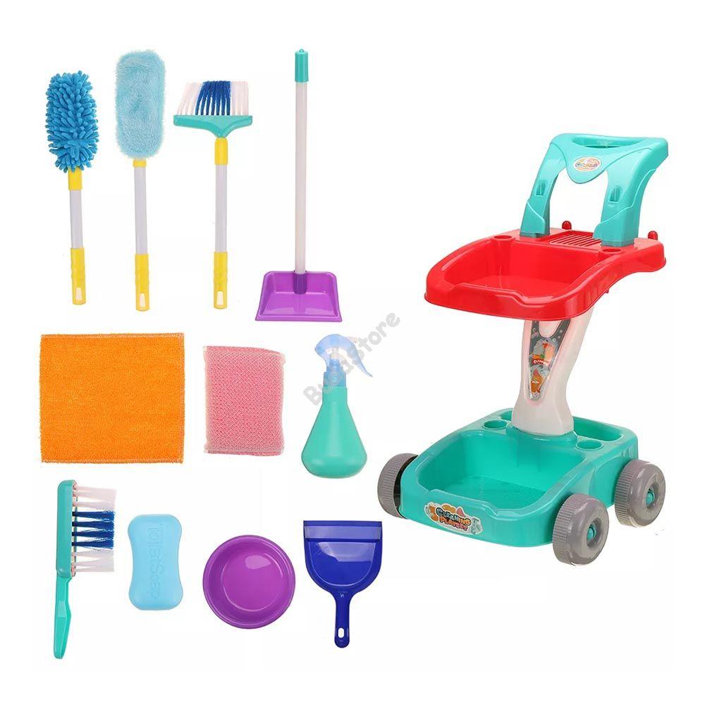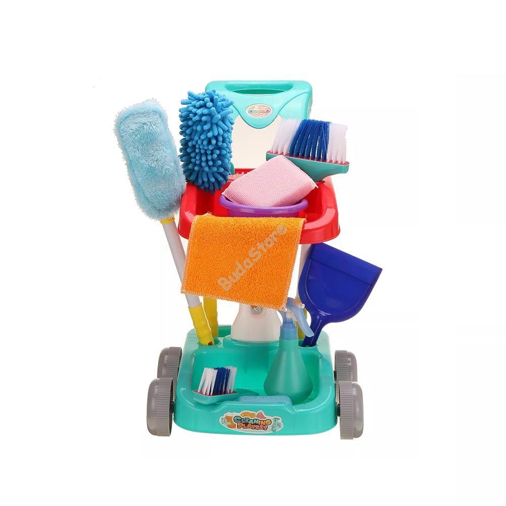 A takarító felszereléssel a kicsik segíthetnek a szülőknek a ház körüli munkában. A játék takarító készlettel a gyerekek játékos formában megtanulhatják a takarító eszközök használatát. A készletben teljesen élethű eszközöket tartalmaz, amivel a gyerekek részt vehetnek a takarításban. A játék segítségével fejleszthető a kreativitás, kommunikáció és fantázia. A csomagban többek között seprűket, lapátokat, felmosókat, játék tiszítószereket találunk.