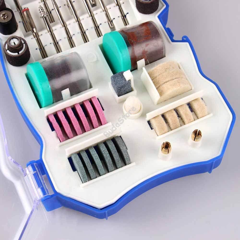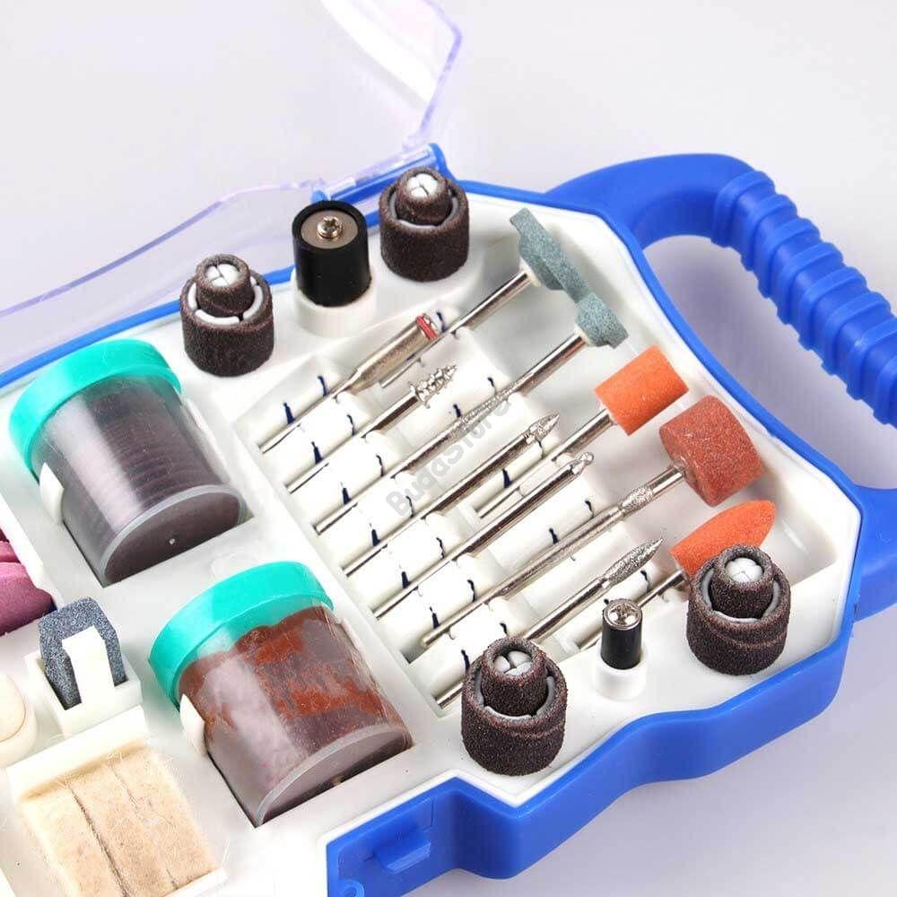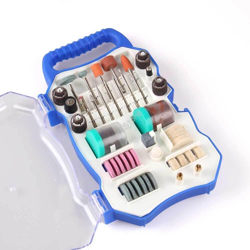 A készlet különböző méretű és típusú kiegészítőket tartalmaz, melyekkel remekül megmunkálhatóak a különböző anyagok.