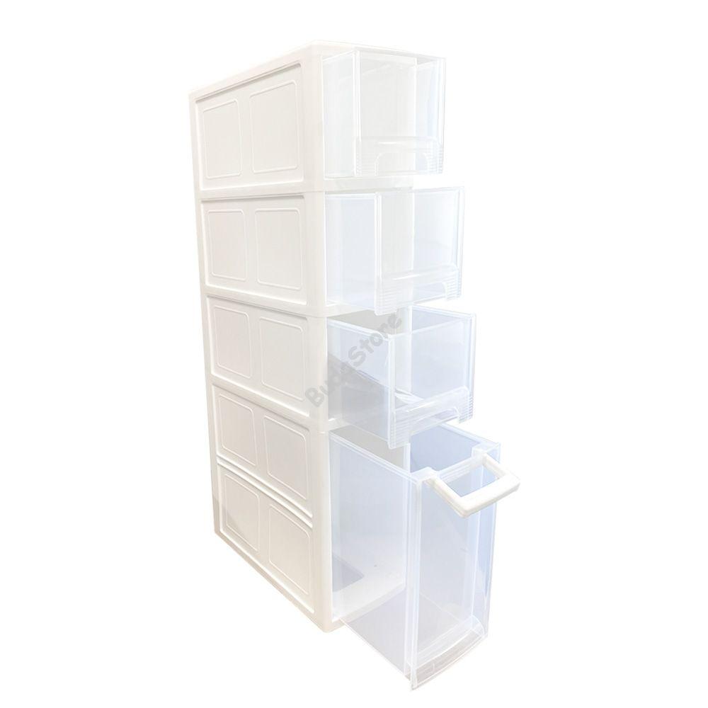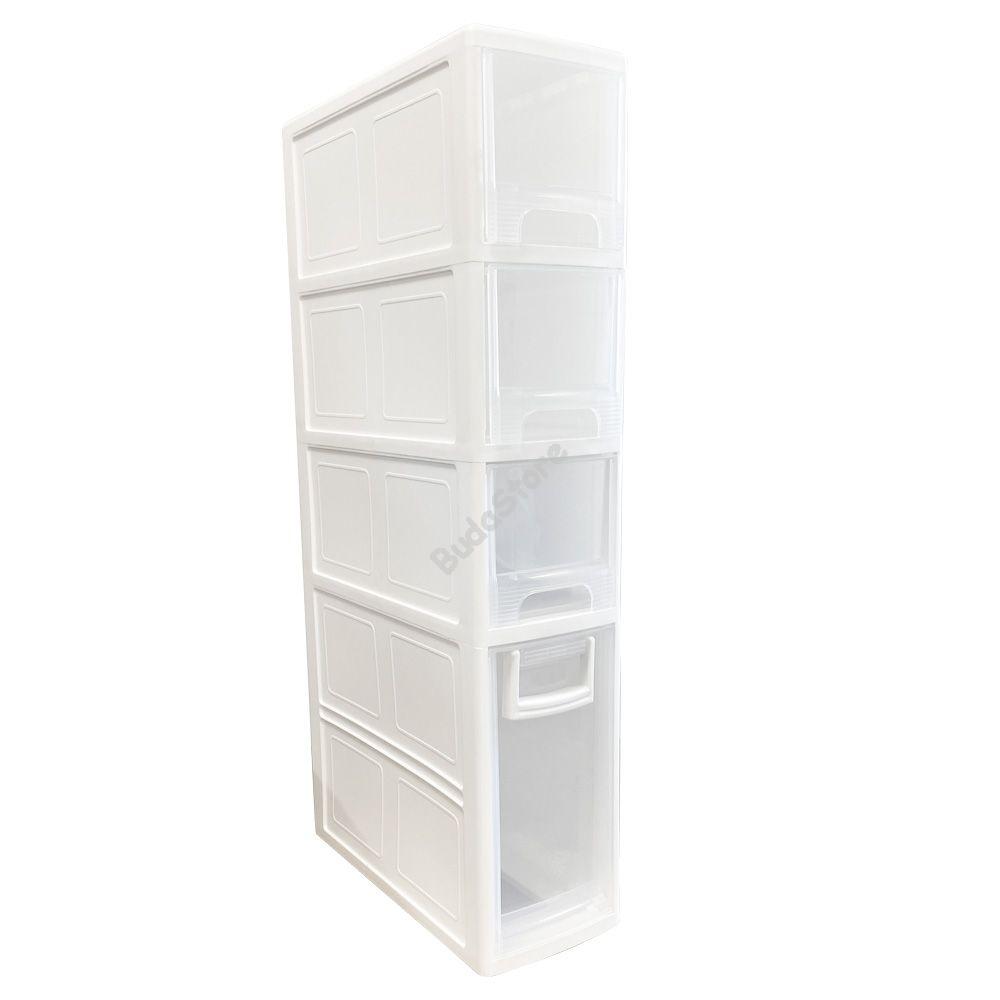 Tágas, különböző méretű fiókokkal ellátott műanyag szekrényünkbe minden helyet kaphat, amit rendszerezve szeretnél tárolni. Legyen szó akár az irodai holmikról, iskolai füzetekről és könyvekről vagy fürdőszobai kiegészítőkről, helytakarékos és praktikus megoldást biztosít. A kerekekkel ellátott váznak köszönhetően könnyen mozgathatod. Letisztult, fehér színével megfelelő lehet irodába, gyerekszobába vagy fürdőbe is.