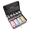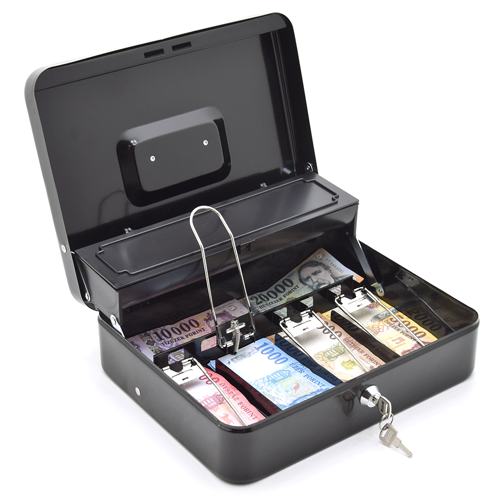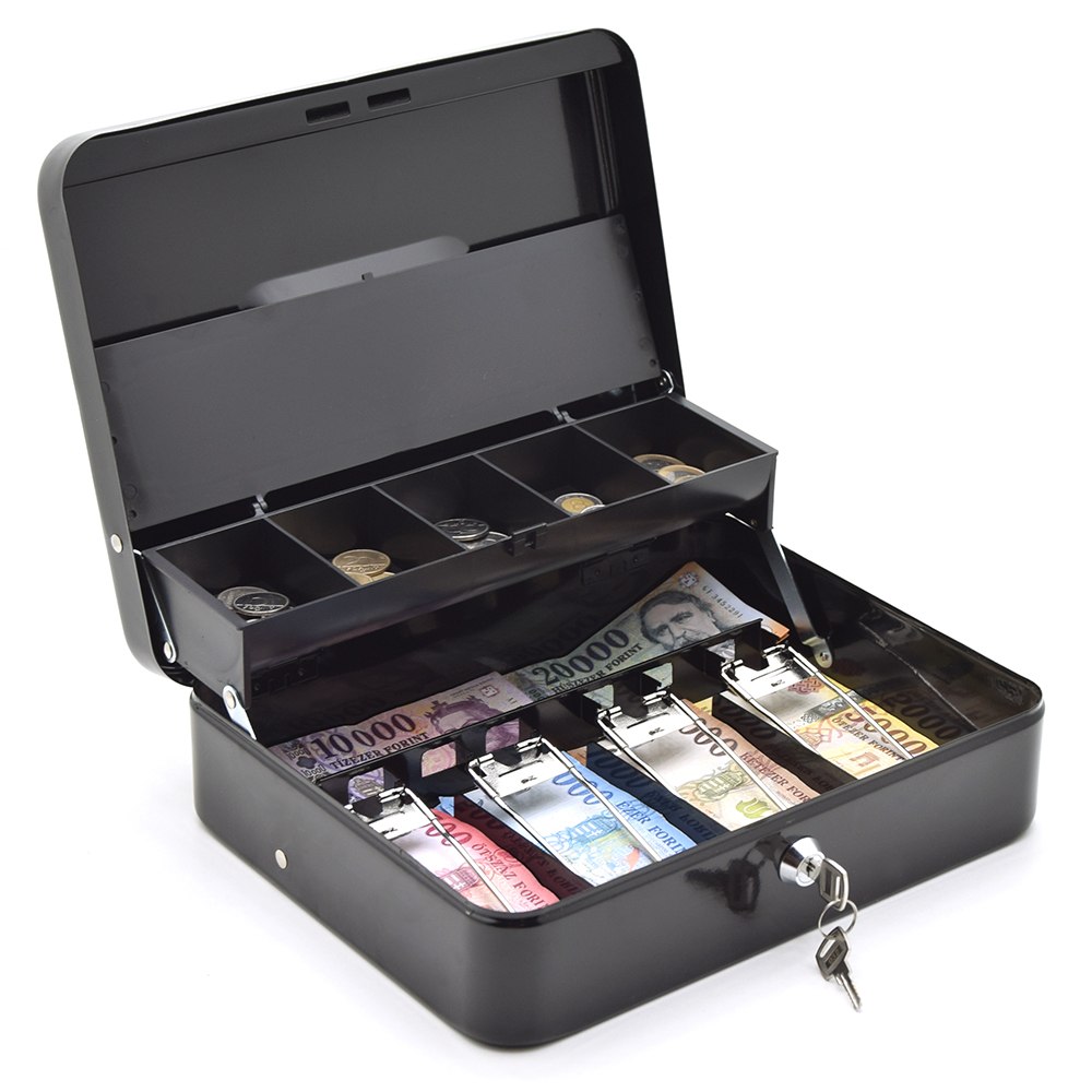 KingSAFE Cash Note Fekete pénztárkazetta KS-CASH-NOTE 8 770 Ft / [2 2%] [5 3%] [10 5%] Gyártó: KingSAFE Cikkszám: S005_KS-CASH-NOTE Vonalkód (EAN13): 5999566030963 Súly: 1,91 kg Átvétel: Ez a termék boltunkban személyesen is átvehető. KingSAFE Cash Note Fekete pénztárkazetta aprópénztartóval KS-CASH-NOTEmélyhúzott acéllemez test és fedélsüllyesztett nikkelezett fogantyúnyitáskor felemelkedő műanyag aprópénztartóöt darab érmetartó rekesz (fedéllel)alul négy rekeszes bankjegytartórugós bankjegy leszorítóvalmögötte további tároló helykettő darab kulccsalfekete színben áruljukTulajdonságokZárszerkezet:KulcsosMagasság:90 mmSzélesség:300 mmMélység:240 mmSzín:FeketeTömeg:1,91 kg Mennyiség Kosárba tesz