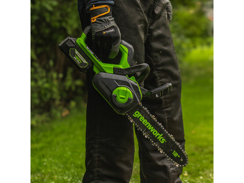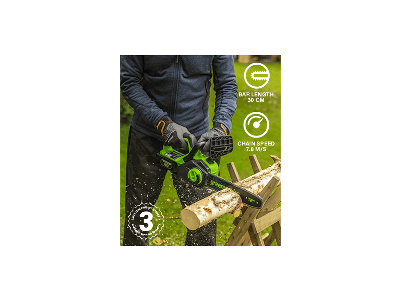 Láncfűrész akkumulátoros Greenworks GD24CS30 24 v, 3/8-1.1-45 szemes, akku- és töltő nélkül 2007007-GW 44 910 Ft / db [2 db 2%] [5 db 3%] [10 db 5%] Gyártó: GREENWORKS Cikkszám: S006_2007007-GW Súly: 4,00 kg Átvétel: Ez a termék boltunkban személyesen is átvehető. A Greenworks GD24CS30 egy kompakt, 30 cm-es vágóhosszal rendelkező, 24 V-os akkus láncfűrész, amelyet kifejezetten otthoni és barkácsfeladatokra terveztek. Robusztus kialakítása mellett könnyű és jól kezelhető, így ideális választás tűzifa darabolásához vagy kerti munkákhoz. A fejlett lítium-ion akkumulátoros rendszernek köszönhetően nincs szükség benzinre vagy hosszabbítókábelre. Egyszerűen helyezze be az akkumulátort, és már kezdheti is a munkát. Mindössze 2,6 kg-os súlya kényelmes használatot biztosít hosszabb vágások során is. A szénkefe nélküli motor nagyobb teljesítményt és hosszabb élettartamot garantál a hagyományos motorokhoz képest. A magas, 7,8 m/s-os láncsebesség tiszta és precíz vágást eredményez minden alkalommal. Az automatikus láncolajozó rendszer folyamatos kenést biztosít a simább működés és a hosszabb élettartam érdekében. Kompakt mérete ellenére megbízható és erőteljes teljesítményt nyújt. A Greenworks 24 V-os család tagjaként az akkumulátor más kompatibilis eszközökkel is használható, így rugalmas és költséghatékony megoldást kínál. Vezetőlemez hossza:30cm Lánc:3/8" 1,1 mm 45 szem Láncsebesség:7,8 m/s Üzemidő (2Ah):legfeljebb 32 vágás Üzemidő (4Ah):legfeljebb 64 vágás Súly:2,6 kg Csomagolási méretek (Szélesség x Magasság x Mélység):35.5x26x18.5cm Típusok: Greenworks: GD24CS30, Mennyiség db Kosárba tesz