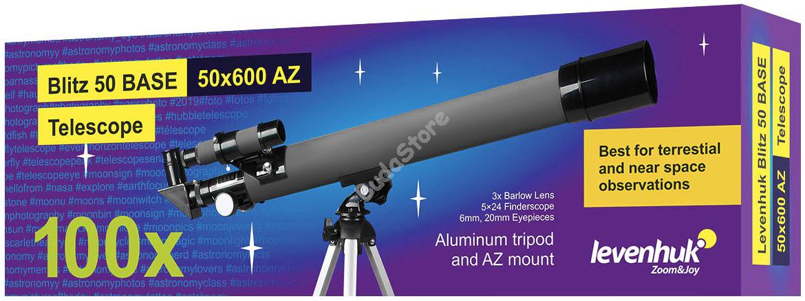 Levenhuk Blitz 50 BASE teleszkóp 77098 24 690 Ft / db [2 db 2%] [5 db 3%] [10 db 5%] Gyártó: LEVENHUK Cikkszám: S101_77098 Súly: 1,96 kg Átvétel: Ez a termék boltunkban személyesen is átvehető. A Levenhuk Blitz 50 BASE teleszkóp egy belépőszintű akromatikus refraktor. A teleszkóp tökéletes választás csillagászat iránt érdeklődő gyerekek vagy kamaszok számára. Egyszerűen kezelhető. Könnyedén tanulmányozható vele a Hold, továbbá a földi objektumok vizsgálatához figyelőtávcsőként is használható. A készletben minden szükséges tartozék megtalálható, így nem kell azokat külön megvásárolnia. A tükröződésgátló bevonattal, optikai üvegből készült lencséknek köszönhetően a teleszkóp kiváló minőségű, tiszta és éles képet nyújt. A klasszikus azimut állványhoz nem tartozik mikrocsavar, illetve állítógomb. Ahhoz, hogy a kiválasztott objektumra irányítsa a teleszkópot, egyszerűen csak el kell forgatni az optikai tubust a kívánt irányba. A teljes magasságban használható, alumínium háromlábú állvány merevítővel van felszerelve, így még stabilabb a szerkezet. A lábak magassága is állítható. A készletben minden szükséges optikai tartozék megtalálható, így egy Barlow-lencse és egy diagonális tükör is. Jellemzők: Teleszkóp kezdő csillagászok számára Üveg optikai elemek tükröződésgátló bevonattal Kiválóan használható a Hold és a földi objektumok tanulmányozására Megfelelően tartalmas optikai tartozékkészlet Egyszerű kezelés – ideális gyermekek és kezdő csillagászok számára A készlet tartalma: Teleszkóp optikai tubusa 6 mm-es szemlencse 20 mm-es szemlencse 3x Barlow-lencse 90°-os diagonális tükör Kereső, 5x24 Azimut állvány Alumínium háromlábú állvány Használati útmutató és élettartamra szóló szavatosság MárkaLevenhuk, Inc., USASzavatosságélettartamEAN5905555002392A csomag méretei (HxSzxM):86x29x10 cmSzállítási súly1.96 kgOptikai kialakításrefraktorOptikai rendszerakromatikusOptikai elemek anyagaoptikai üvegOptikai bevonattükröződésgátlóObjektívlencse átmérője (rekesznyílás), mm50Fókusztávolság, mm600Legnagyobb gyakorlati nagyítás, x100Rekesznyílásf/12Felbontási küszöbérték, ívmásodperc2.3Határmagnitúdó10.59SzemlencsékН6 mm (100x), H20 mm (30x)Szemlencsetubus átmérője, hüvelyk0,965Barlow-lencse3xKeresőtávcsőoptikai, 5x24Fókusz-állítófogaslécesHáromlábú állványalumíniumHáromlábú állvány magassága, mm630—1130TeleszkópszabályozáskéziÁllványalt-azimutOptikai tubus rögzítési módjacsavarokOptikai tubus anyagafémFelhasználói szintgyerekeknek, kezdőkAz összeszerelés és a telepítés nehézségi szintjerendkívül egyszerűMegfigyelt objektuma Naprendszer bolygói, földi objektumok Mennyiség db Kosárba tesz