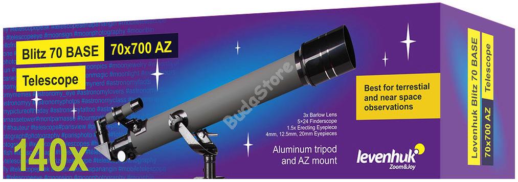 Levenhuk Blitz 70 BASE teleszkóp 77101 44 640 Ft / db [2 db 2%] [5 db 3%] [10 db 5%] Gyártó: LEVENHUK Cikkszám: S101_77101 Súly: 3,70 kg Átvétel: Ez a termék boltunkban személyesen is átvehető. A Levenhuk Blitz 70 BASE teleszkóp ideális választás a világűr tanulmányozásához. Egyrészről könnyen kezelhető, másrészről számos különböző csillagászati objektum megfigyelhető vele. A rekesznyílásnak (70 mm) köszönhetően részletesen tanulmányozható a Hold, a naprendszer bolygói, valamint a fényes mélyég-objektumok. A földi tájak megfigyeléséhez hatékony figyelőtávcsőként is használható. A teleszkóp akromatikus refraktorszerkezeten alapul. A lencsék üvegből készültek. Az optikai elemek tükröződésgátló bevonatot kaptak, így a kapott kép a teljes látómezőn át éles és tiszta. A villa alakú azimut állvány függőleges tengelyén egy mikrocsavar található, amely segítségével pontosan ráállítható a teleszkóp a kiválasztott objektumra. Az alumínium háromlábú állványon tartozéktartó tálca is helyet kapott. A háromlábú állvány magassága állítható. A készletben számos különböző tartozék található, így azokat nem kell már külön beszerezni. Érdeklődésének megfelelően bármilyen 31,75 mm-es szemlencsetubus-átmérőjű optikai tartozék felszerelhető – ezt a fókuszállító teszi lehetővé. Jellemzők: Akromatikus refraktor a világűr felfedezéséhez Földi objektumok megfigyelésére figyelőtávcsőként is használható Üveg optikai elemek tükröződésgátló bevonattal Villa alakú azimut állvány, a függőleges tengelyen mikrocsavarral Bővített optikai tartozékkészlet A készlet a következőket tartalmazza: Teleszkóp optikai tubusa 4 mm-es szemlencse 12,5 mm-es szemlencse 20 mm-es szemlencse 1,5x felfelé álló szemlencse 3x Barlow-lencse 90°-os diagonális tükör Kereső, 5x24 Azimut állvány Alumínium háromlábú állvány tartozéktartó tálcával Használati útmutató és élettartamra szóló szavatosság MárkaLevenhuk, Inc., USASzavatosságélettartamEAN5905555002422A csomag méretei (HxSzxM):73x23x15 cmSzállítási súly3.7 kgOptikai kialakításrefraktorOptikai rendszerakromatikusOptikai elemek anyagaoptikai üvegOptikai bevonattükröződésgátlóObjektívlencse átmérője (rekesznyílás), mm70Fókusztávolság, mm700Legnagyobb gyakorlati nagyítás, x140Rekesznyílásf/10Felbontási küszöbérték, ívmásodperc1.7Határmagnitúdó11.33Szemlencsék1,5х felfelé álló szemlencse, H12,5 mm (56х), H20 mm (35x), SR4 mm (175х)Szemlencsetubus átmérője, hüvelyk1,25Barlow-lencse3xKeresőtávcsőoptikai, 5x24Fókusz-állítófogaslécesHáromlábú állványalumíniumHáromlábú állvány magassága, mm670—1230TartozéktálcayesTeleszkópszabályozáskéziÁllványalt-azimutOptikai tubus rögzítési módjacsavarokOptikai tubus anyagafémFelhasználói szintgyerekeknek, kezdőkAz összeszerelés és a telepítés nehézségi szintjerendkívül egyszerűMegfigyelt objektuma Naprendszer bolygói, földi objektumokKibővített tartozékkészletyes Mennyiség db Nem rendelhető