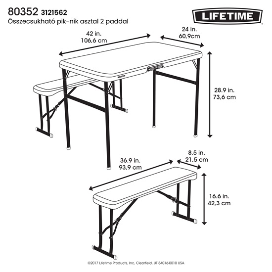 LIFETIME összecsukható pad asztal szett 3121562 54 680 Ft / db [2 db 2%] [5 db 3%] [10 db 5%] Gyártó: LIFETIME Cikkszám: S032_3121562 Vonalkód (EAN13): 3610882958152 Súly: 18,00 kg LIFETIME összecsukható pad asztal szett 3121562 Lifetime összecsukható asztal, két összecsukható paddal 2 ÉV GARANCIA UV álló, kiváló minőségű polietilén (HDPE) asztal- és ülőfelület Rozsdaálló, porfestett acél keret Összecsukható, kis helyen tárolható és szállítható Könnyű kiszerelés Könnyen tisztítható Kül- és beltéri felhasználásra Technikai adatok Asztal nyitva: 106,5 x 66 x 71, 1 cm (H x Sz x M) Asztal összecsukva: 106,5 x 66 x 8,8 cm (H x Sz x M) Pad nyitva: 86,4 x 23 x 40,3 cm (H x Sz x M) Asztallap vastagsága: 53 mm Ülőfelület vastagsága: 42 mm Tömeg: 16,7 kg Mennyiség db Kosárba tesz
