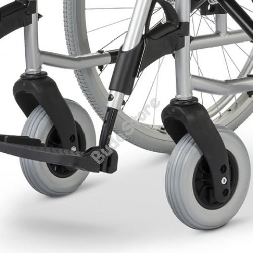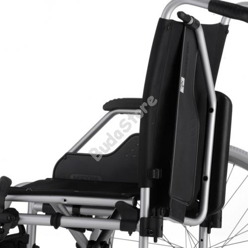 Meyra Budget 9.050 kerekesszék 43cm 93 270 Ft / db [2 db 2%] [5 db 3%] [10 db 5%] Gyártó: MEYRA Cikkszám: S035_800102 Súly: 18,00 kg Meyra Budget 9.050 kerekesszék 43cm Összecsukható, sztenderd kivitelű, nagy terhelhetőségű, acélvázas kerekesszék. Összecsukható váz Felhajtható és kivehető kartámasszok Felhajtható talptámasz Magasságban állítható és levehető lábtartó Acél hajtókarikás tömör, rögzítőfékkel ellátott meghajtó (hátsó) és bolygókerekek (első) Lumbális hajlattal ellátott háttámla Könnyen tisztántartható gyöngyvászon üléstámla és ülőlap Kivehető hátsó kerekek Javasolt nagyfokú végleges járásnehezítettség esetén, ha a beteg egyéb járást segítő eszközzel hosszabb távú helyváltoztatásra képtelen. A kerekesszék főként rövid idejű használatra megfelelő. Azt a célt szolgálja, hogy Ön képes legyen beltéri (lakás, gondozó otthon) mozgásra, lakásának rövid idejű elhagyására, friss levegőn tartózkodhasson és eljuthasson lakásának környezetében lévő, az életviteléhez tartozó helyekre, mint például bevásárló hely, gyógyszertár stb., valamint elérje és használni tudja a tömegközlekedési eszközöket. Alkalmazható továbbá kórházakban, rendelőintézetekben, valamint minden olyan intézményben, ahol mozgássérült, ill. helyváltoztatási nehézségekkel küzdő, vagy attól orvosilag eltiltott személyeket (betegeket) kell különböző okok miatt mozgatni. Sztenderd kivitelű, nagy terhelhetőségű, acélvázas kerekesszék. A kartámasza csapott kivitelű, mely asztal mellett is használható, valamint az Ön kényelme érdekében magasságban állíthatóak. A kerekesszékbe való beülést és kiszállást segítendő a kartámaszok fel- és hátrahajthatók, kivehetők, valamint ruhavédő lemezzel vannak ellátva.Nagyon jó gördülési tulajdonsággal bíró kerekesszék, melynek ideális súlypont elhelyezése lehetővé teszi a járdaszegélyekre történő könnyű feljutást (ezért elsősorban dinamikus, megfelelő egyensúlyérzékű embereknek javasoljuk). Ezüst színű porlakkozott kivitelben készül fekete gyöngyvászon háttámla és üléshuzattal. A kerekesszék sokrétű beállítási lehetőségei garantálják, az Ön igényeinek legjobb kielégítését. A vádli tartó tépőzáras heveder megakadályozza a lábak hátracsúszását a talptámaszról. A heveder hossza a tépőzárak oldása után a kívánt hosszra beállíthatóak. Termék jellemzők Beülőszélesség: 38 cm, 40 cm, 43 cm, 46 cm, 48 cm, 51 cm Beülőmélység: 43 cm Ülésmagasság (Ülőlap magassága a földtől mérve): 47 cm (párna nélkül) Háttámla magasság (ülőfelülettől): 42 cm Súly: 17,5 kg Teljes szélesség: Beülőszélesség + 18 cm Összecsukott szélesség: 28 cm Hosszúság: 102-108 cm (lábtartóval) Magasság: 96 cm Legnagyobb terhelhetőség: 130 kg Első kerekek átmérője és fajtája: 180 x 40 mm (7”) PU, tömör Hátsó kerekek átmérője és fajtája: 610 mm (24 x 1 3/8”) PU, tömör Max. akadálymagasság : 0-tól 100 mm-ig Minimális fordulási sugár: 1250 mm Mennyiség db Kosárba tesz