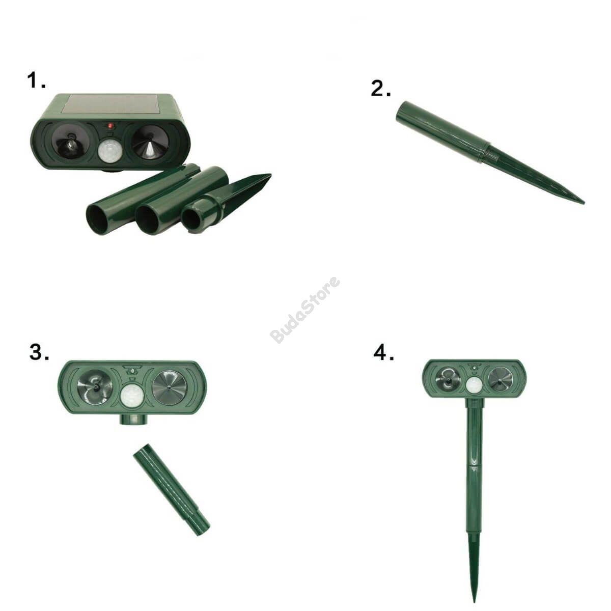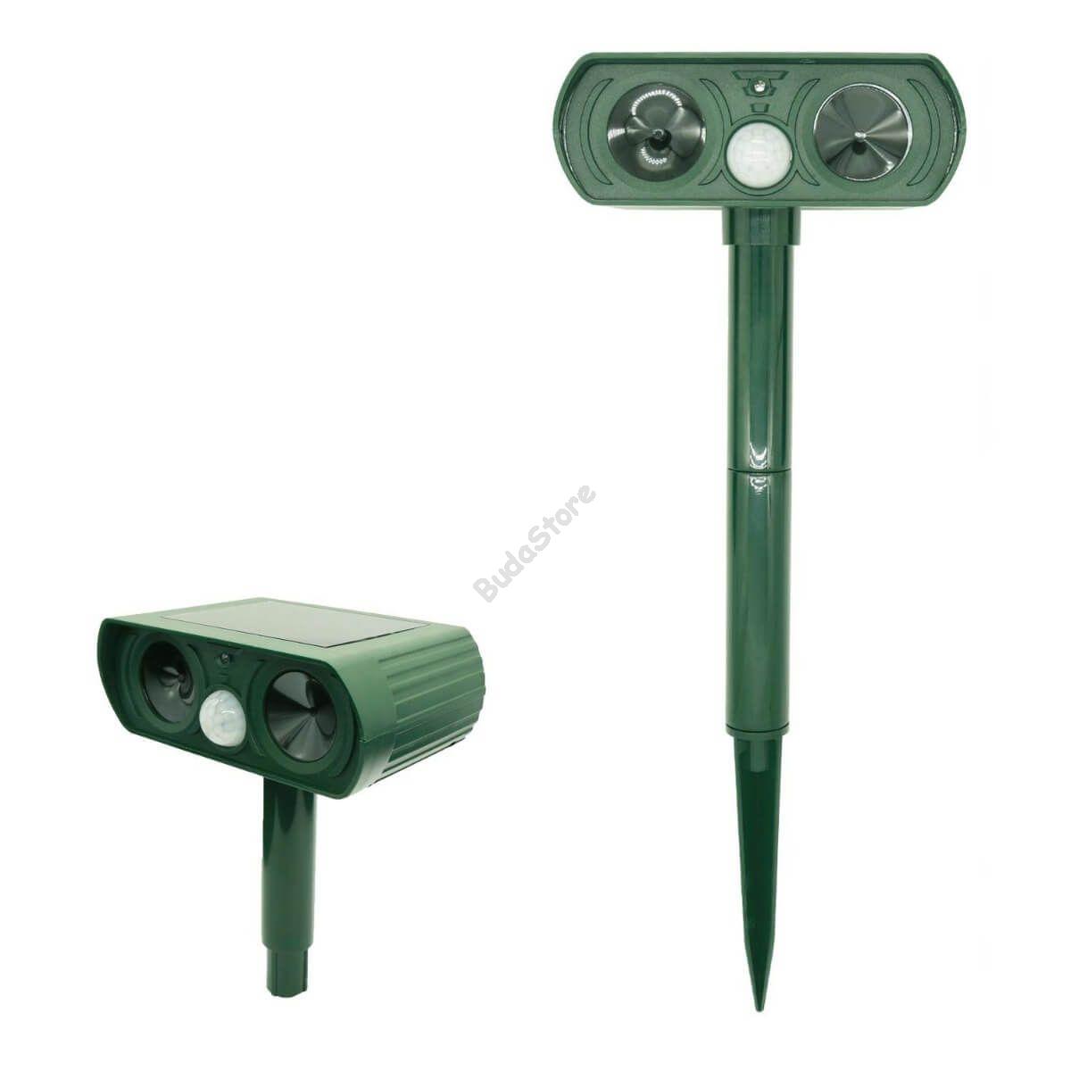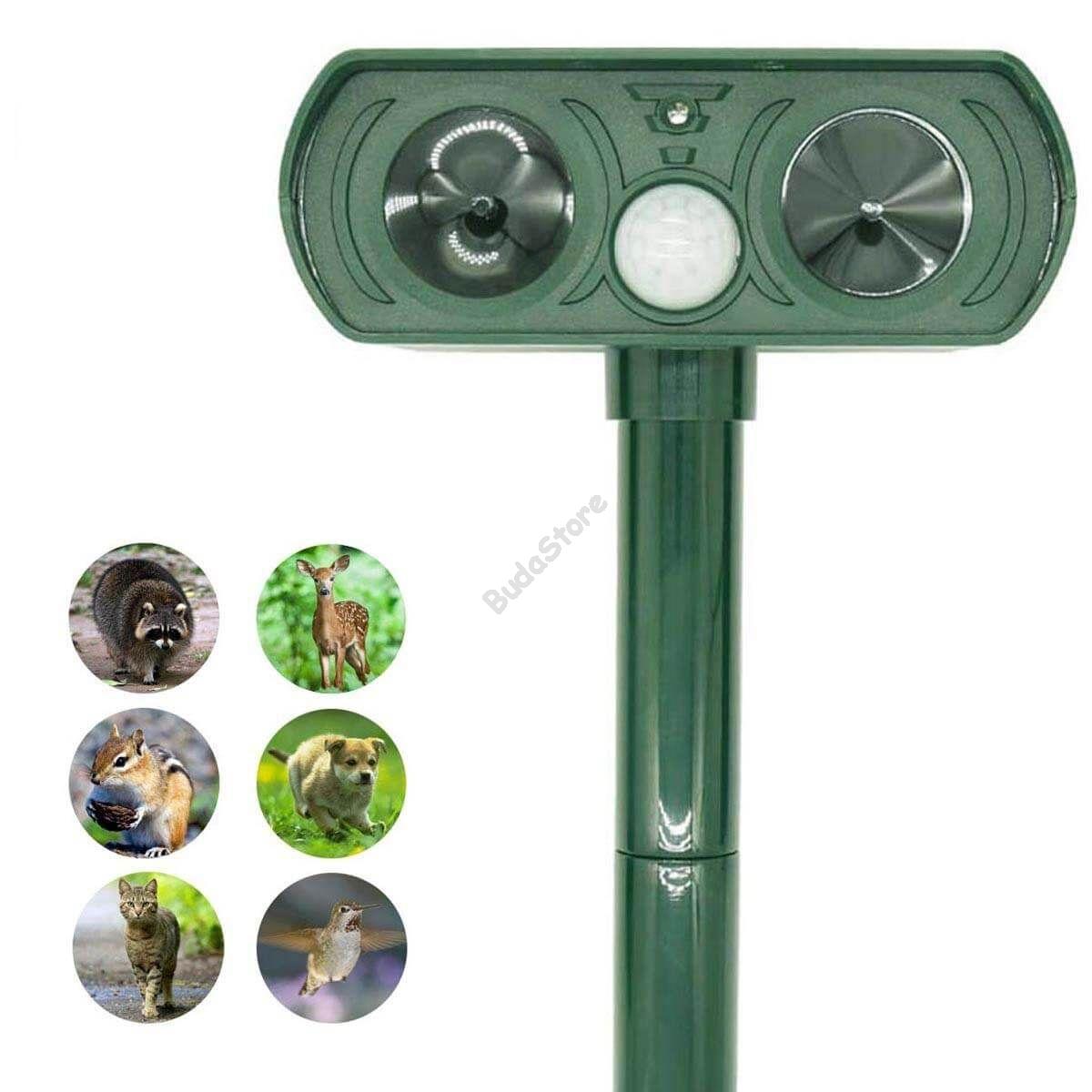 A napelemes állatriasztó infravörös szenzora érzékeli a mozgást, majd aktiválja az ultrahangos hangszórót, mely elriasztja az állatokat. A hullám azt követően aktiválódik, hogy az állat a PIR szenzor hatósugarába lépett, az állat kényelmetlenül fogja érezni magát és elmenekül az adott területről. (egér, patkány, kutya, róka, nyest, macska, mosómedve, borz, denevér, madár, galamb, rágcsálók stb. elriasztására)