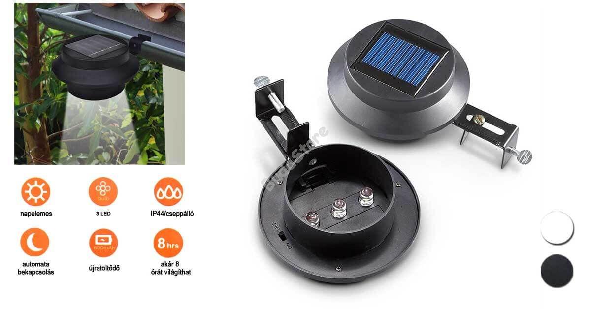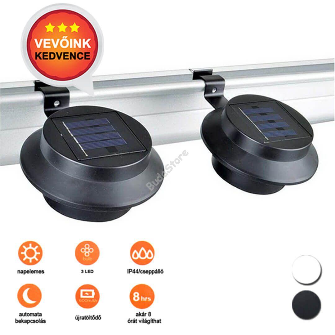 Napelemes kültéri lámpa cseppálló borítással. Egyszerűen rögzíthetőek az ereszcsatornára, kerítésre, balkon korlátra. Vezeték nélkül, egyszerűen felszerelhetőek. A kerti lámpák Időjárásálló, tartós házzal rendelkeznek.  Hosszan világítanak a Nap segítségével újra töltődő napelemnek köszönhetően. Napközben a szolár panel átalakítja a napenergiát elektromos energiává, amelyet az újratölthető akkumulátorban tárol el. Elegendő fényt biztosítanak az éjszakai tájékozódáshoz, akár a kocsibeállónál, garázsnál, bejáratnál.