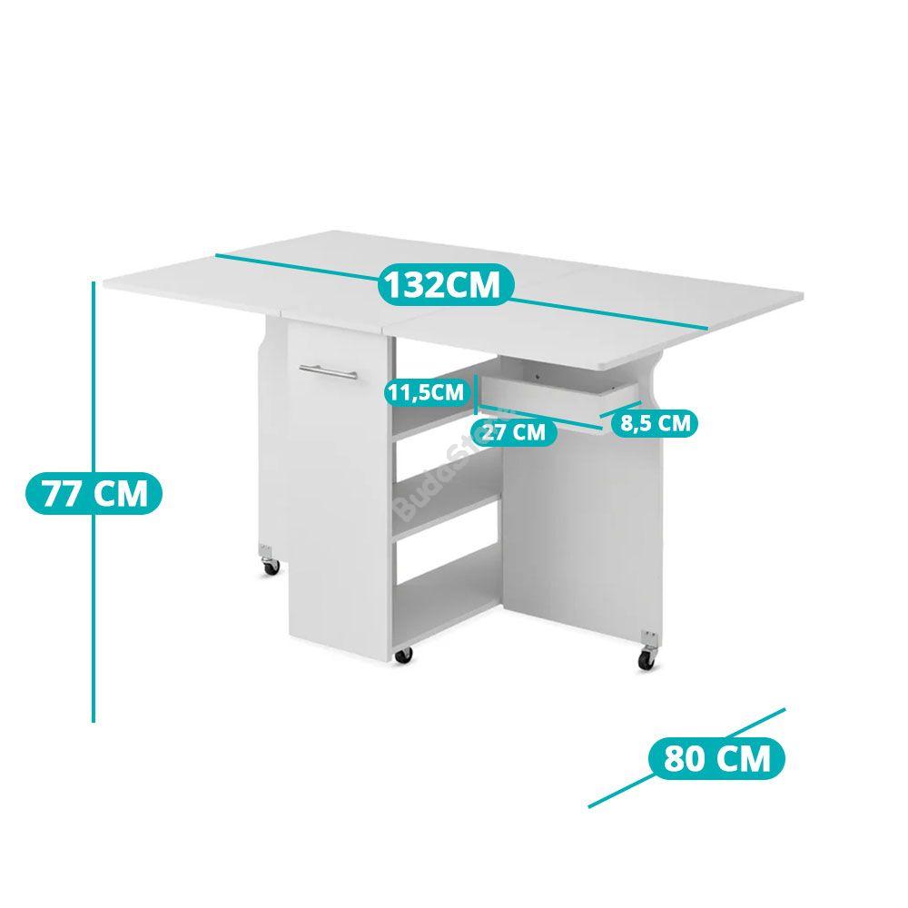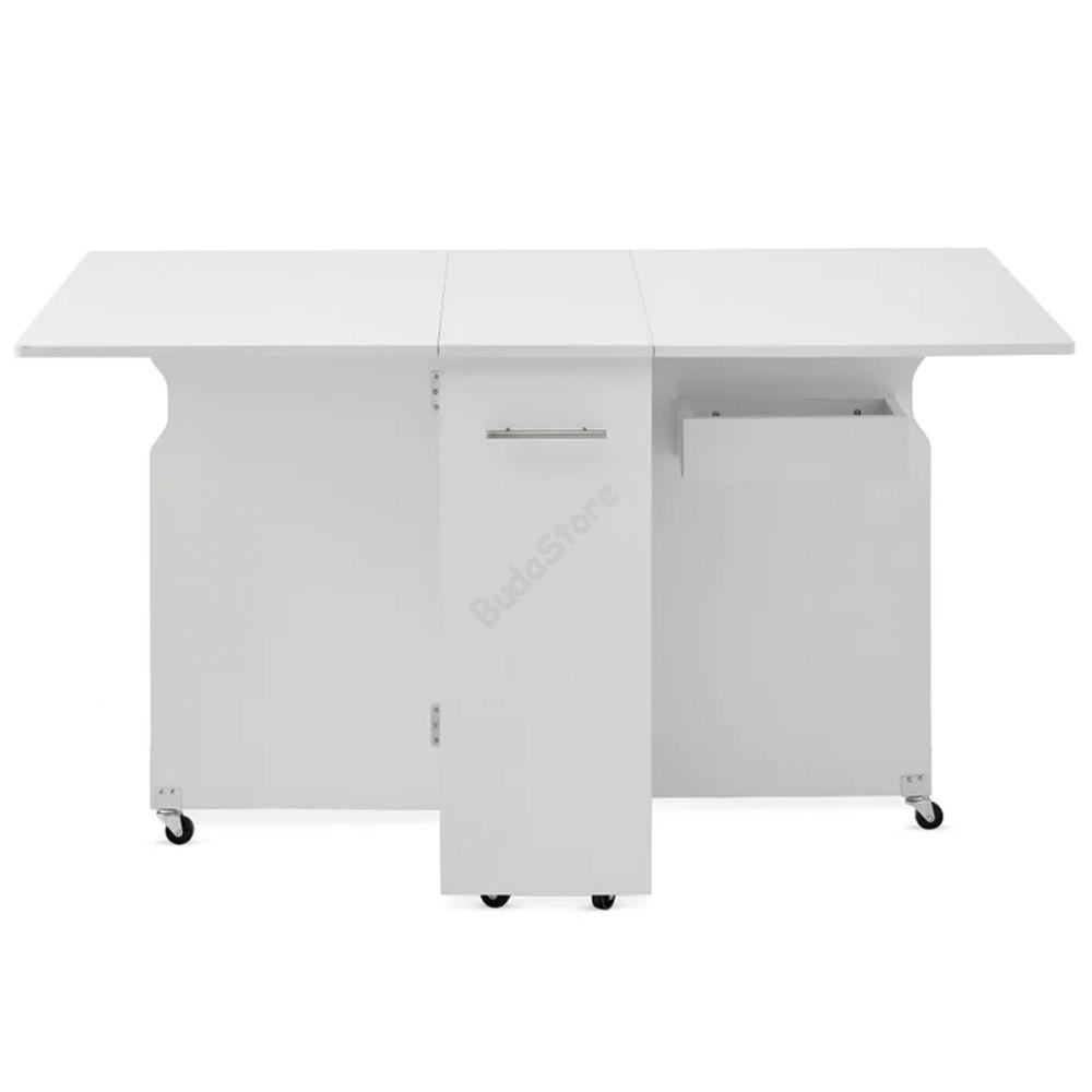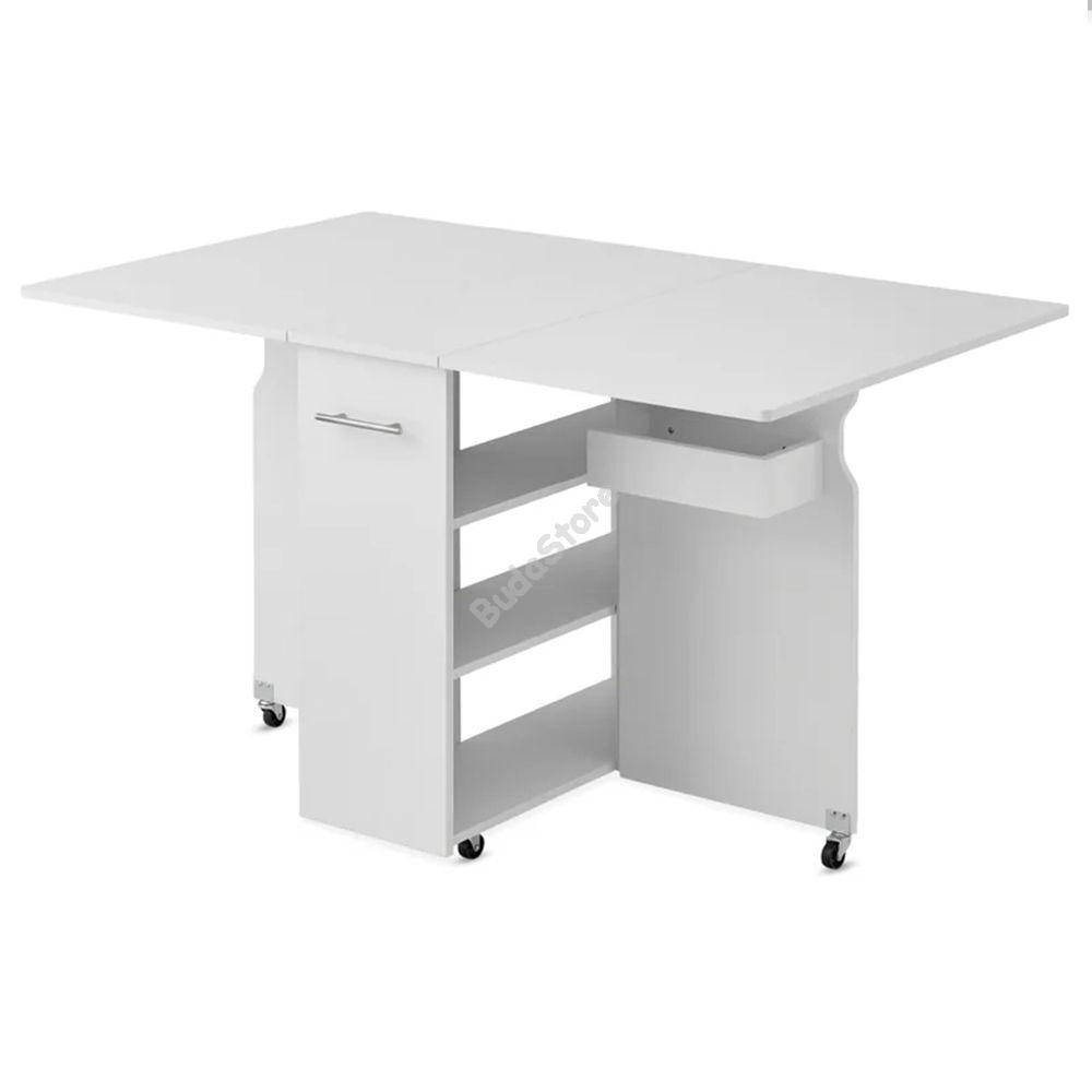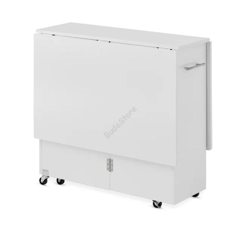 Kerekekkel ellátott kialakításának köszönhetően bármely helyiségbe könnyedén áthelyezheted. Lehajtható asztallapjával és belső, fiókos rekeszével tárolóvá alakíthatod így használhatod a dolgozószobában munkaasztalnak vagy elhelyezheted az étkezőben is. Kinyitható asztallapjával  pillanatok alatt étkezőasztallá varázsolhatod ha szükséged van rá vagy vendégeid érkeznének. Legnagyobb előnye, hogy helytakarékos, ajtóval eltakart rekesszel rendelkezik így bármilyen stílusú otthonba megtalálhatod számára a megfelelő helyet.