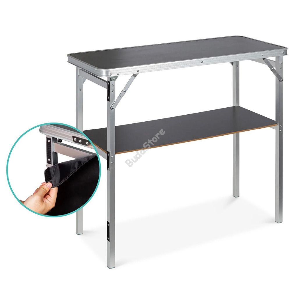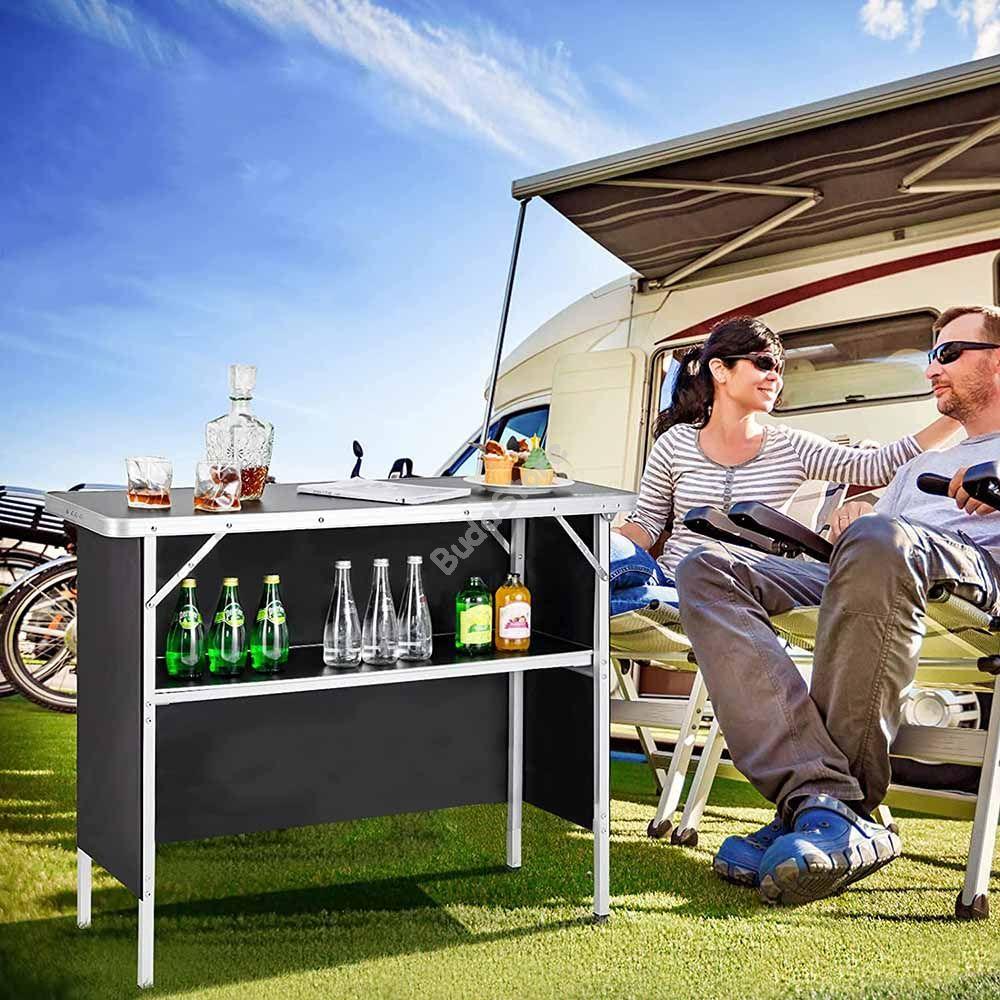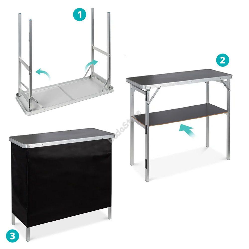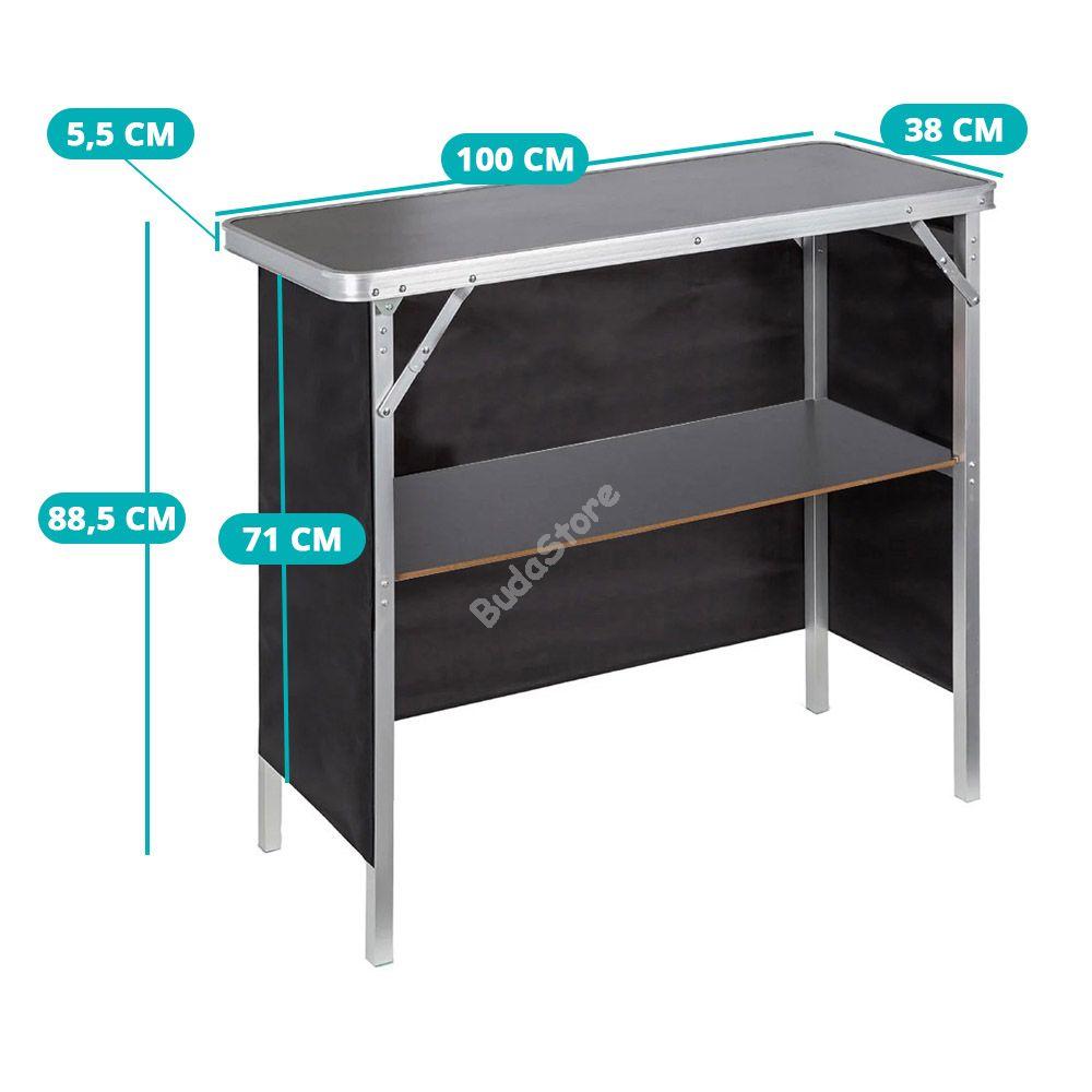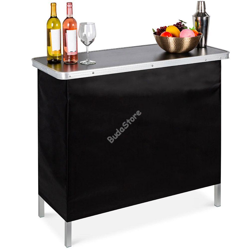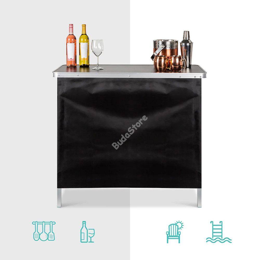 Vidd magaddal az igazi koktélbárok érzését és légy a kerti partik királya! Könnyen összecsukható és hordtáskájában magaddal viheted a barátaidhoz, nyaralásra vagy kempingezésre. Kül-és beltéri használatra egyaránt használható. Oldalsó takaró fala tépőzárral ellátott és levehető, így könnyen tisztítható és esztétikusan eltakarja az alsó polcon tárolt italokat és kiegészítőket. Maximális teherbírása 30 kg.