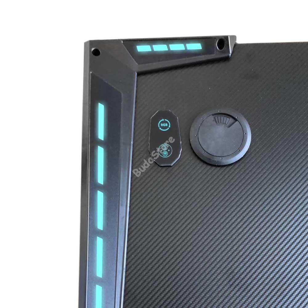 A professzionális gamer asztal karbonszálas bevonattal, és LED világítással megadja azt a játékélményt amire vágysz. Pohártartója és 2 db kábelvezető nyílása biztosítja az igazán kényelmes játékot, karbonszálas bevonatának köszönhetően pedig az asztal teljes felületén használhatod egeredet. Az oldalán található akasztó gondoskodik róla, hogy fejhallgatód mindig kéznél legyen. A 4 féle LED világítást a hozzá tartozó USB segítségével működtetheted.