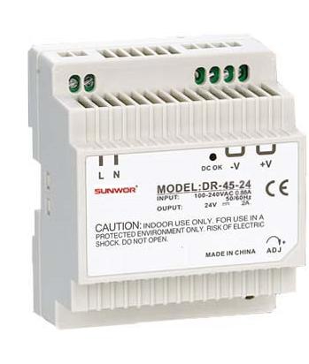 SUNWOR DR-45-24 DIN sínre szerelhető kapcsolóüzemű tápegység DR4524 8 120 Ft / db [2 db 2%] [5 db 3%] [10 db 5%] Gyártó: SUNWOR Cikkszám: S003_114262 Súly: 0,30 kg Átvétel: Ez a termék boltunkban személyesen is átvehető. SUNWOR DR-45-24 DIN sínre szerelhető kapcsolóüzemű tápegység DR4524DIN sínre szerelhető kapcsolóüzemű tápegység, 24 VDC, 1,9 A, 45W.- Kapcsolóüzemű tápegység.- Stabilizált kimeneti feszültség.- DIN sínre szerelhető kivitel (TS-35/7.5, tS-35/15).- Sorkapcsos csatlakozás.- Kimeneti feszültség: 24 VDC (+/- 10% szabályzási lehetőséggel).- Kimenet áram: maximum 1.9 A.- Kimeneti teljesítmény: 45 W.- Hullámzás és zaj: maximum 150 mVp-p.- Szigetelési ellenállás: 100 MOhm/500 VDC.- Túláramvédelem: névleges áram 105 - 150%-nál.- Túlfeszültség védelem: névleges feszültség 115% - 135%-nál.- Hatásfok: 83%.- LED-es állapotjelzés.- Tápfeszültség: 90 - 264 VAC/47 - 63 Hz.- Áramfelvétel: 0.48 A.- Működési hőmérséklet: -20°C - +60°C.- Működési páratartalom: 20 - 90 %.- Méret: 78 mm x 93 mm x 56 mm.- Tömeg: 270 g.- Megfelel az EN55022, CLASSA és UL1012 szabványoknak.- CE és RoHS tanúsítvány. Mennyiség db Kosárba tesz