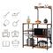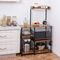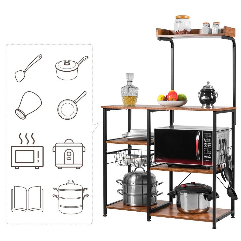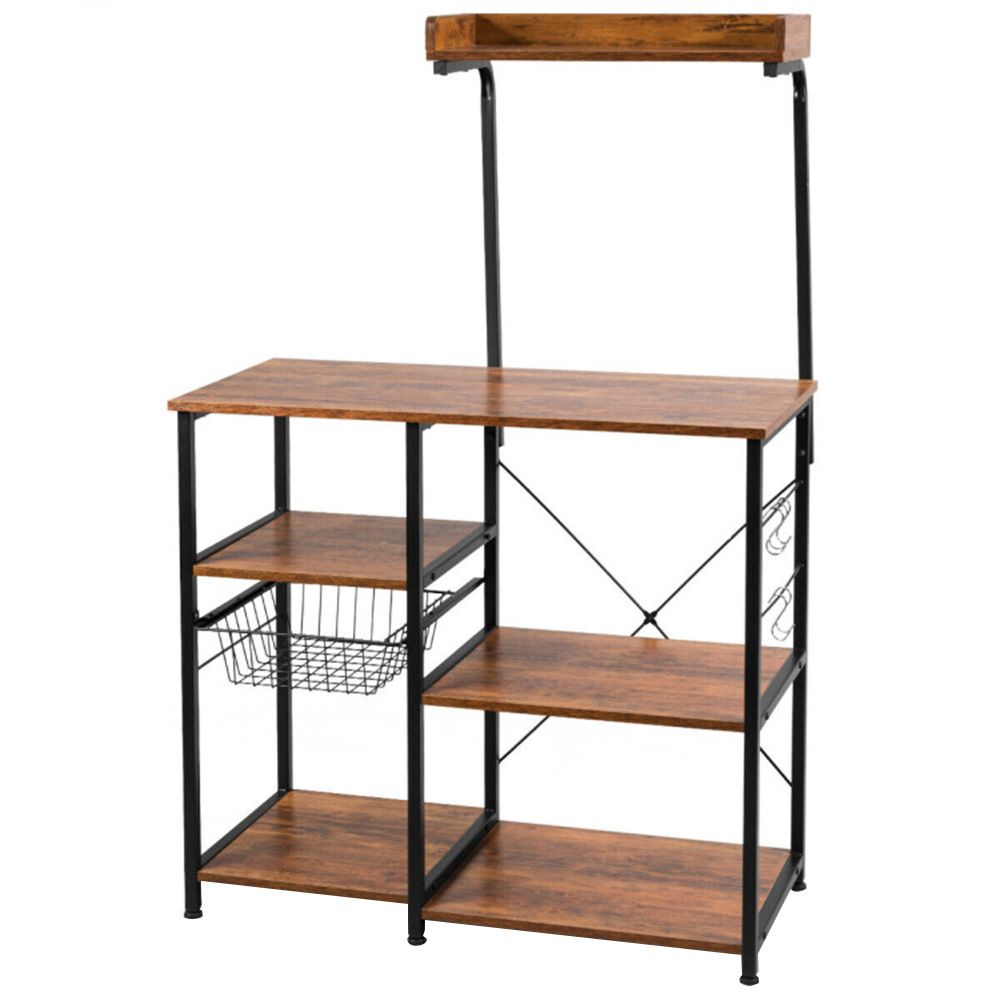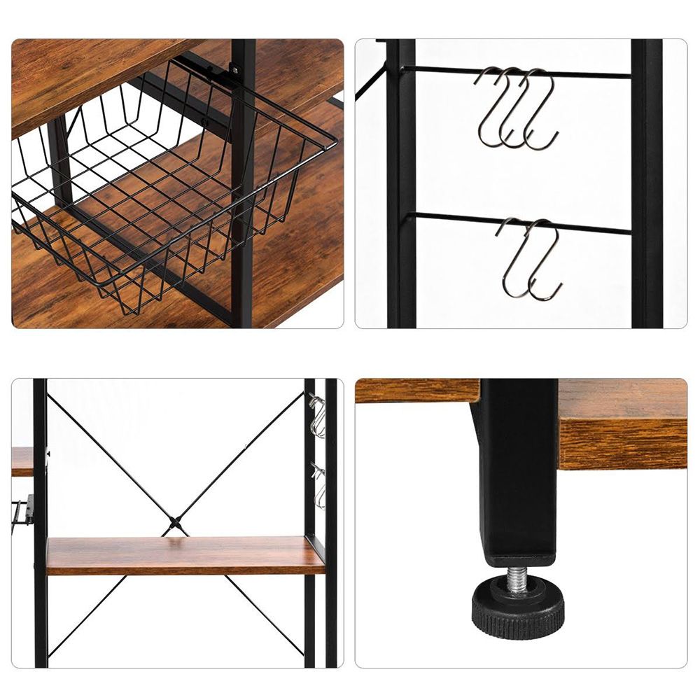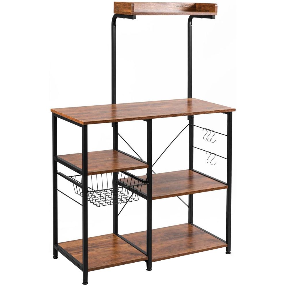 Strapabíró vaskerettel ellátott polcrendszer, mely a sötétbarna polcokkal kombinálva stílusos tárolóhelyet biztosít. Akár a kisebb konyhai gépeknek keresel megfelelő helyet, akár a napi szinten használatos kiegészítőket helyeznéd el, jó megoldás lesz számodra tároló állványunk. Praktikus tároló kosarát feltöltheted nassolnivalóval, száraztésztákkal és egyéb élelmiszerekkel, de helyet kaphatnak benne receptjeid is. Oldalsó akasztói jó tároló megoldást nyújtanak a konyharuhák, háztartási eszközök elhelyezésére is, így minden kéznél lesz mikor szükséged van rá.