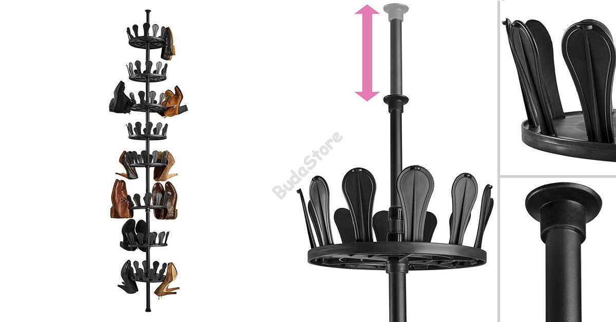 A teleszkópos cipőtartó állvány sokkal többet nyújt mint egy hagyományos cipősszekrény! Rendkívül sok, összesen 48 pár cipő tárolására alkalmas, egy cipőtartó tálcán pedig összesen 12 darab cipő fér el. Nem foglal sok helyet, magassága állítható, így sokkal szabadabban választhatod ki állandó helyét mint egy cipőtároló szekrény esetében. Az állványon található cipőtartó tálcák helyzete változtatható. Kis méretű cipők, gyerekcipők esetében közelebb húzhatjuk őket egymáshoz, helyet adva a nagyobb lábbelik, csizmák számára. Helyezd el az előszobában, vagy akár a gardróbszobában.