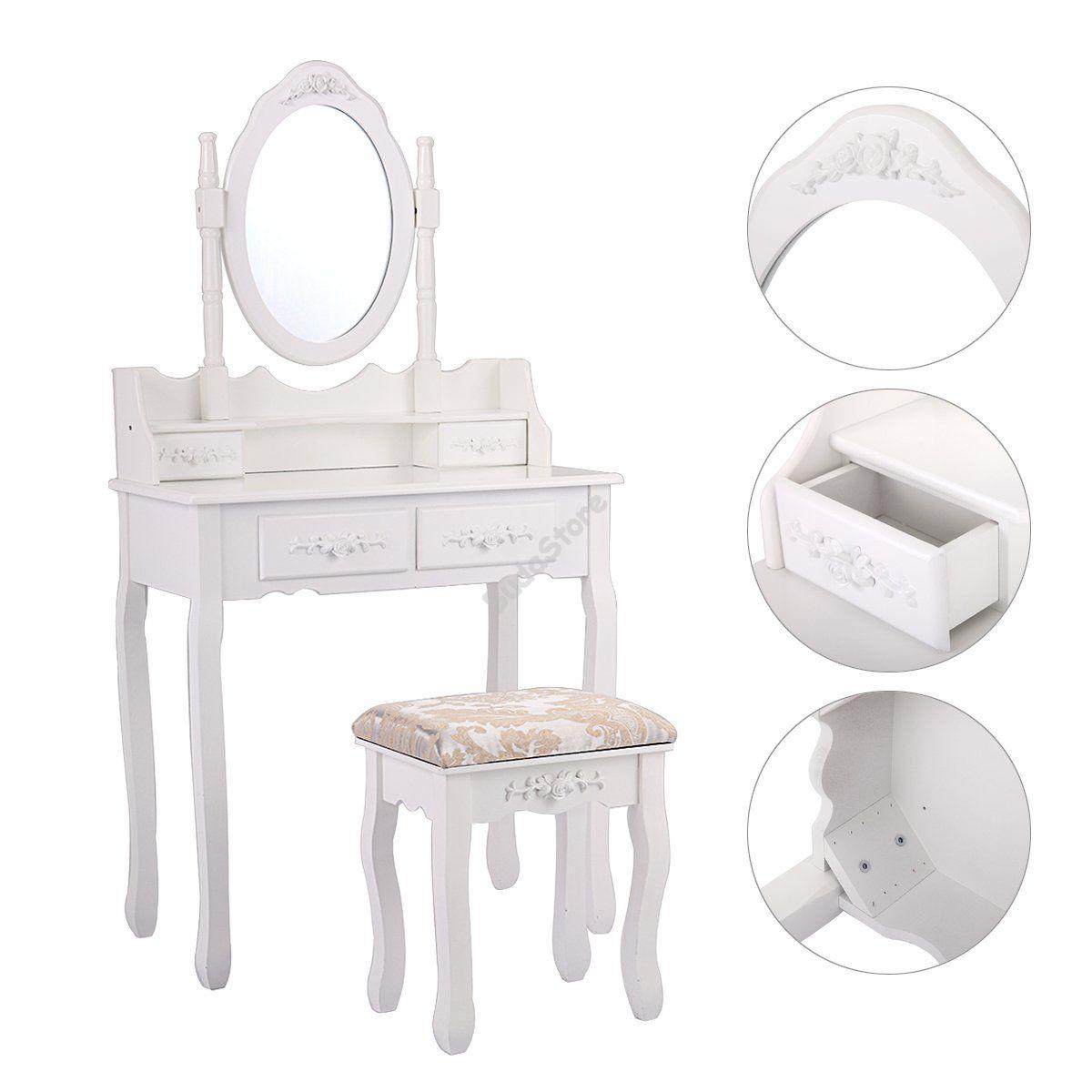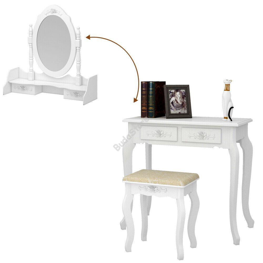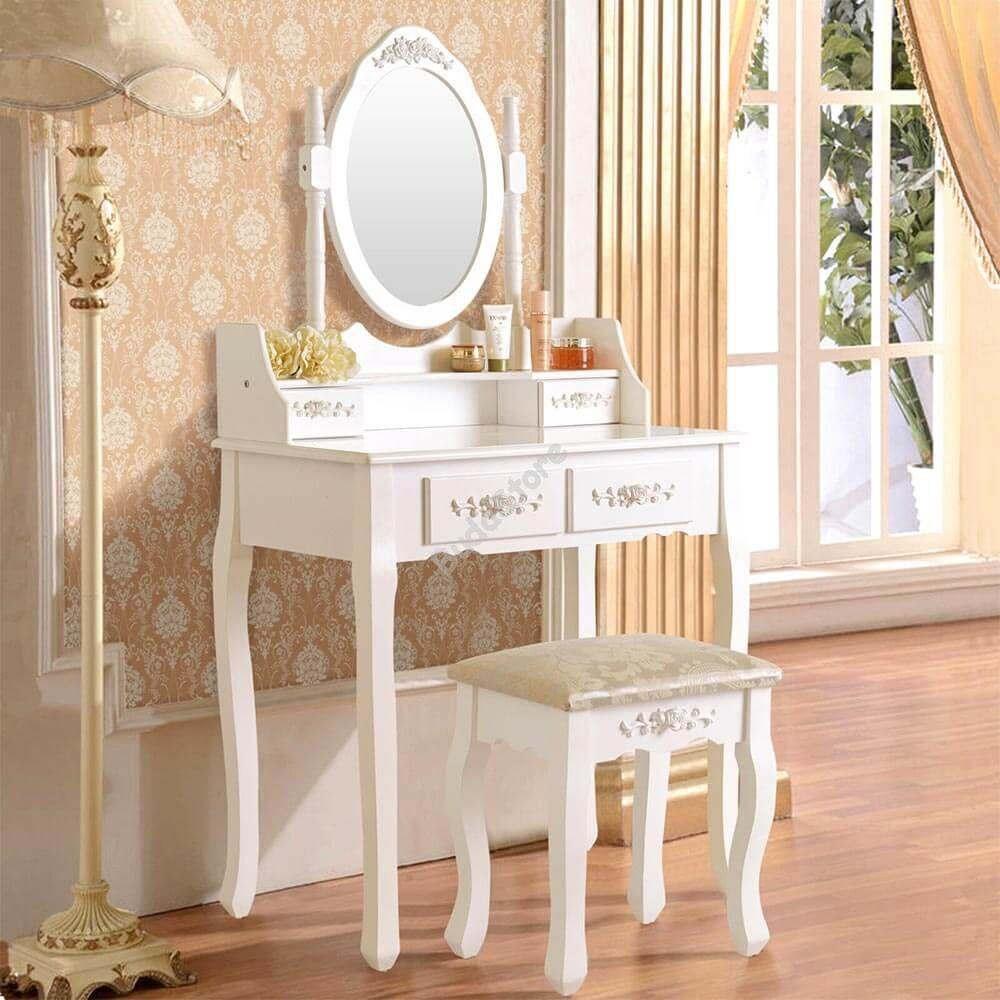 Fából készült, tükrös fésülködő asztal és szék hálószobába, öltözőbe, gardrób szobába. Elegáns fehér színe és kialakítása miatt igazi dísze lesz a lakásnak. 2 db kisebb és 2 db nagyobb fiókkal rendelkezik, melyekbe kényelmesen pakolhatod bele ékszereidet, sminkjeidet, egyéb kiegészítőidet.