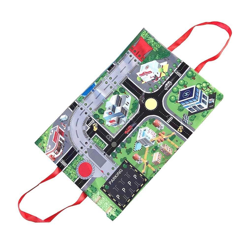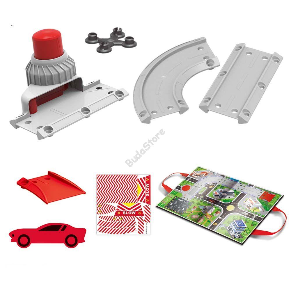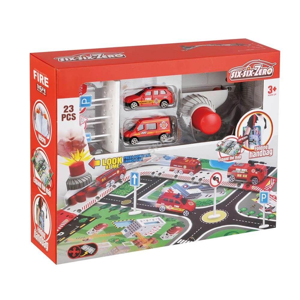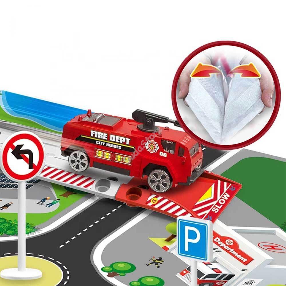 Tűzoltós szőnyeg szett ami a gyerekszoba központja lehet. Interaktív szőnyeg, mellyel mégizgalmasabb lesz a játék. Száguldhat a város utcin a tűzoltó autóval, a felhelyezhető táblákkal pedig elsajátíthatja a közlekedés alapjait. A járművek mozgását sem kell feltétlenül manuálisan megoldania, a játszószőnyeghez tartozó gombbal kilőhetik az autót és megfigyelhetik, ahogy az arra kijelölt útszakaszon végighalad.