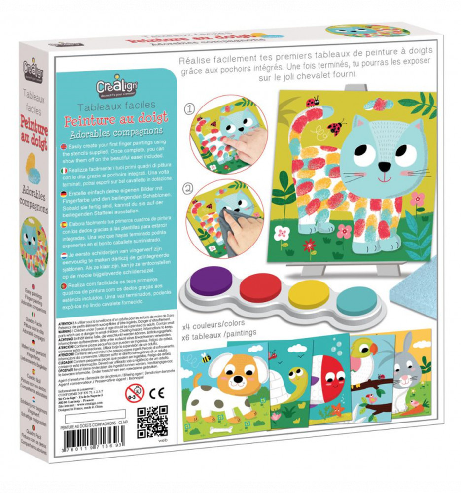 Ujjfestés -Kis kedvencek CreaLign CL160 7 490 Ft / db [2 db 2%] [5 db 3%] [10 db 5%] Gyártó: CREALIGN' Cikkszám: S140_CL160 Vonalkód (EAN13): 3760119713693 Súly: 0,30 kg Kiváló készségfejlesztő a kisebb gyermekeknek! A képeket úgy tudják elkészíteni, hogy ecset helyett a saját ujjukat használják és mártják a festékbe. A fóliának köszönhetően a képek nem fognak elkenődni és nagyon szép fantáziadús és egyedi festmények születnek. A készlet tartalma: 6 db, részben színes, kreatívlap 4 db bőrbarát ujjfesték (citromsárga, világoskék, piros, lila) fólia lap képtartó állvány Francia design a Crealign' gyártótól. Saját forgalmazású termék. Jellemzők Korcsoport: 3 éves kortól Kinek ajánljuk: Lányoknak és fiúknak Mennyiség db Kosárba tesz