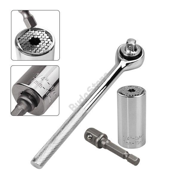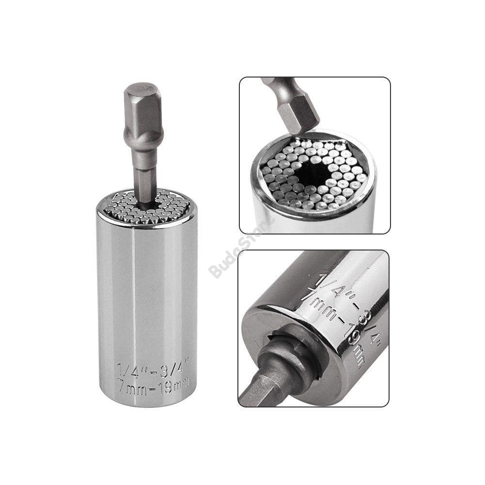 Az univerzális racsni csatlakozófeje tartalmaz 54 db edzett acélból készült rugós rudacskát, amelyek a csavar méretéhez igazodva stabilan körbeveszik azt. A rugónak köszönhetően a belső rudak besüllyednek a méretnek megfelelően. Automatikusan igazodnak minden ¼” – ¾” anyához, illetve 7-19 mm-es csavarhoz. Mivel segítségével lényegesen nagyobb erőt tudunk kifejteni, így alkalmas személyes és szakmai, ipari felhasználásra is. Nagyszerűen működik metrikus, normál, szárnyas anyák vagy szemes csavarok, négyzet vagy hatszög anyák esetében stb.