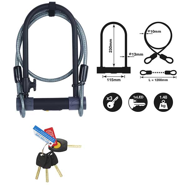 Yale YUL2C/13/230/1 Szürke kerékpár U lakat és sodrony kombináció YUL2C132301 13 230 Ft / [2 2%] [5 3%] [10 5%] Gyártó: Yale Cikkszám: S005_YUL2C132301 Vonalkód (EAN13): 5052847091906 Súly: 1,48 kg Átvétel: Ez a termék boltunkban személyesen is átvehető. Yale YUL2C/13/230/1 Szürke kerékpár U lakat és sodrony kombináció YUL2C132301 extra erős biciklizár, 1200 mm-es acél kábellel és tartóval ultra edzett acél kengyel kettős reteszeléssel védőburkolat a testen és a kengyelen puha műanyag burkolat véd a karcoktól szennyeződés és fröccsenő víz ellen védett precíziós zárszerkezet speciális lézervágott kulcs (kódkártyás) finomnyitás elleni védelem szemes kábellel kombinálva nagyobb tárgyhoz is rögzíthető praktikus tartónak köszönhetően könnyen szállítható nagyértékű kerékpárok és e-kerékpárok rögzítésére ajánljuk négy kulccsal (ebből egy világít) szállítjukTulajdonságokZárszerkezet:KulcsosKengyel vastagság:13 mmKengyel távolság:115 mmKengyel magasság:230 mmÁtmérő:10 mmHossz:1200 mmAnyag:AcélSzín:SzürkeTömeg:1,48 kg Mennyiség Kosárba tesz