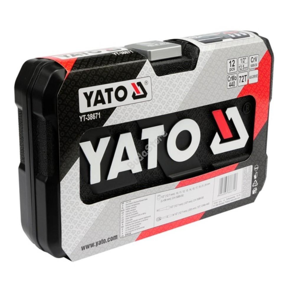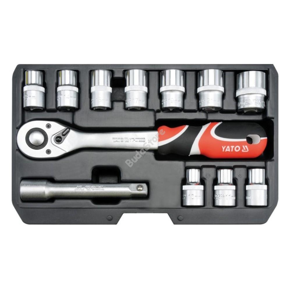 YATO Dugókulcs készlet 12 részes 1/2 col: 10-24 mm - YT-38671 11 200 Ft / db [2 db 2%] [5 db 3%] [10 db 5%] Gyártó: YATO Cikkszám: S052_YT-38671 Vonalkód (EAN13): 5906083386718 Súly: 1,90 kg - Méretek: 1/2": 10-11-12-13-14-15-17-19-21-24 mm (L=38 mm)- Hossz: 38 mm- Anya CrV50BV30- Toldószár 1/2"/127 mm- Hajtószár: 72T 1/2"/255 mm CrMo 440A professzionális szerszámkészlet, melyet speciális autóipari és mechanikai szolgáltatások igényeinek kielégítésére fejlesztettek ki. A dugókulcsok és a hajtószárak meghajtása tartós szerszámacélból készül. A dugókulcsokat kovácsolással készítették, és a keményedés előtt kalibráltak precíziós mérőeszközökkel. AS-Drive rendszerrel ellátott dugófejek, amelyek a maximális nyomatékot 25% -kal növelik, az anyák éleinek teljes védelme mellett. Mennyiség db Kosárba tesz