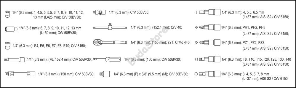 YATO Dugókulcs klt. 56 részes 1/4 col: 4-13 mm CrV - YT-14501 13 800 Ft / db [2 db 2%] [5 db 3%] [10 db 5%] Gyártó: YATO Cikkszám: S052_YT-14501 Vonalkód (EAN13): 5906083145018 Súly: 1,75 kg • 1/4": 4-4,5-5-5,5-6-7-8-9-10-11-12-13 mm / L= 25 mm CrV 50BV30 • 1/4": 6-7-8-9-10-11-12-13 mm / L= 50 mm CrV 50BV30 • 1/4": E4-E5-E6-E7-E8-E10 CrV 50BV30 • 1/4" bit: 4-5,5-6,5 mm / L= 37 mm AISI S2 CrV 6150 • 1/4" bit: PH1-PH2-PH3 / L= 37 mm AISI S2 CrV 6150 • 1/4" bit: PZ1-PZ2-PZ3 / L= 37 mm AISI S2 CrV 6150 • 1/4" bit: T8-T10-T15-T20-T25-T30-T40 / L= 37 mm AISI S2 CrV 6150 • 1/4" bit: 3-4-5-6-7-8 mm / L= 37 mm AISI S2 CrV 6150 • hajtószár: 72T CrV 6140 Mennyiség db Kosárba tesz