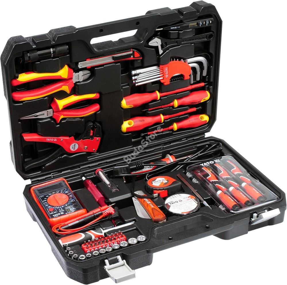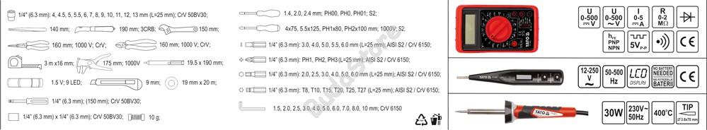 YATO Szerszámkészlet villanyszerelőknek 68 részes 1/4 col ~ - YT-39009 47 000 Ft / db [2 db 2%] [5 db 3%] [10 db 5%] Gyártó: YATO Cikkszám: S052_YT-39009 Vonalkód (EAN13): 5906083390098 Súly: 4,53 kg • Dugókulcs 1/4” (6.3 mm): 4, 4.5, 5, 5.5, 6, 7, 8, 9, 10, 11, 12, 13 mm (L=25 mm) CrV 50BV30 • Csipesz: 140 mm • Műszaki kés: 190 mm • Franciakulcs: 150 mm • Hósszúcsőrű fogó: 160 mm 1000 V-ig szigetelt CrV • Oldalcsípő fogó: 160 mm 1000 V-ig szigetelt CrV • Mérőszalag: 3 m x 16 mm • Blankoló fogó: 175 mm • Ónszippantó: 19.5 x 190 mm • LED lámpa: 1.5 V 9 LED • Törhető pengés kés: 9 mm • Szigetelőszalag: 19 mm x 20 m • Behajtószár: 1/4” (6.3 mm) (150 mm) CrV 50BV30 • Forrasztó ón:10 g • Precíziós csavarhúzó készlet: 1.4, 2, 2.4 mm PH00, PH0, PH1 S2 • Csavathúzó készlet 1000 V-ig szigetelt: 4x75, 5.5x125, PH1x80, PH2x100 mm S2 • Bithegy lapos: 1/4” (6.3 mm): 3, 4, 5, 5.5, 6 mm (L=25 mm) AISI S2 • Bithegy PH: 1/4” (6.3 mm): PH1, PH2, PH3 (L=25 mm) AISI S2 • Bithegy torx: 1/4” (6.3 mm): T8, T10, T15, T20, T25, T27 (L=25 mm) AISI S2 • Bithegy hex: 1/4” (6.3 mm): 2, 2.5, 3, 4, 5, 6 (L=25 mm) AISI S2• Imbuszkulcs készlet: 1.5, 2, 2.5, 3, 4, 5, 6, 7, 8, 10 mm CrV 6150 • Digitális mérőműszer • Digitális voltmérő • Forrasztópáka Mennyiség db Kosárba tesz