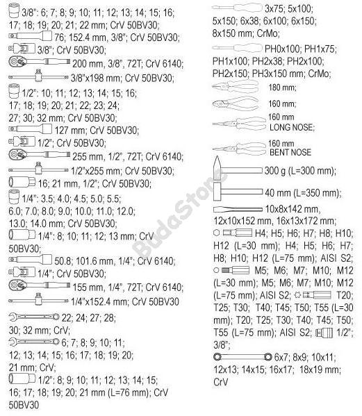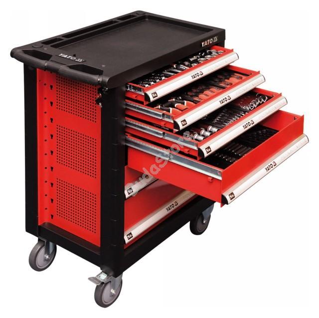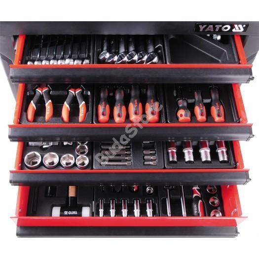 YATO Szerszámkocsi szerszámokkal 177 részes ~ - YT-5530 297 200 Ft / db [2 db 2%] [5 db 3%] [10 db 5%] Gyártó: YATO Cikkszám: S052_YT-5530 Vonalkód (EAN13): 5906083955303 Súly: 72,86 kg Mérete: 958 x 766 x 465 mm177 db-os szerszámkészlet6 db görgős fiók - a felső kettő 25 kg, a többi 35 kg teherbírással rendelkezikKocsi 4 élénél elasztikus-lökhárító a sérülések megelőzéséreMegerősített (dupla lemezes), szellőző burkolatEpoxi porfestékkel borítvaMasszív kerekek. Egy kerék befékezhetőKis induló erő. Kb 7 kg-os fogantyúCsúszásmentes, ergonomikus fogantyúKözponti zárral ellátott fiókok, 2 db kulccsalPolipropilén, csúszásmentes munkalap Mennyiség db Kosárba tesz