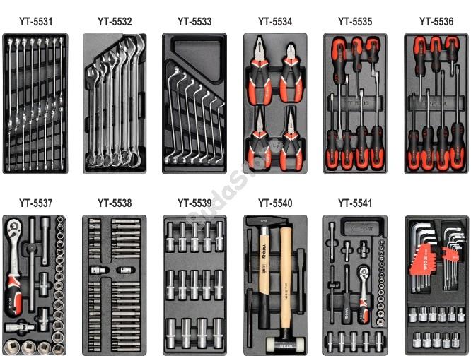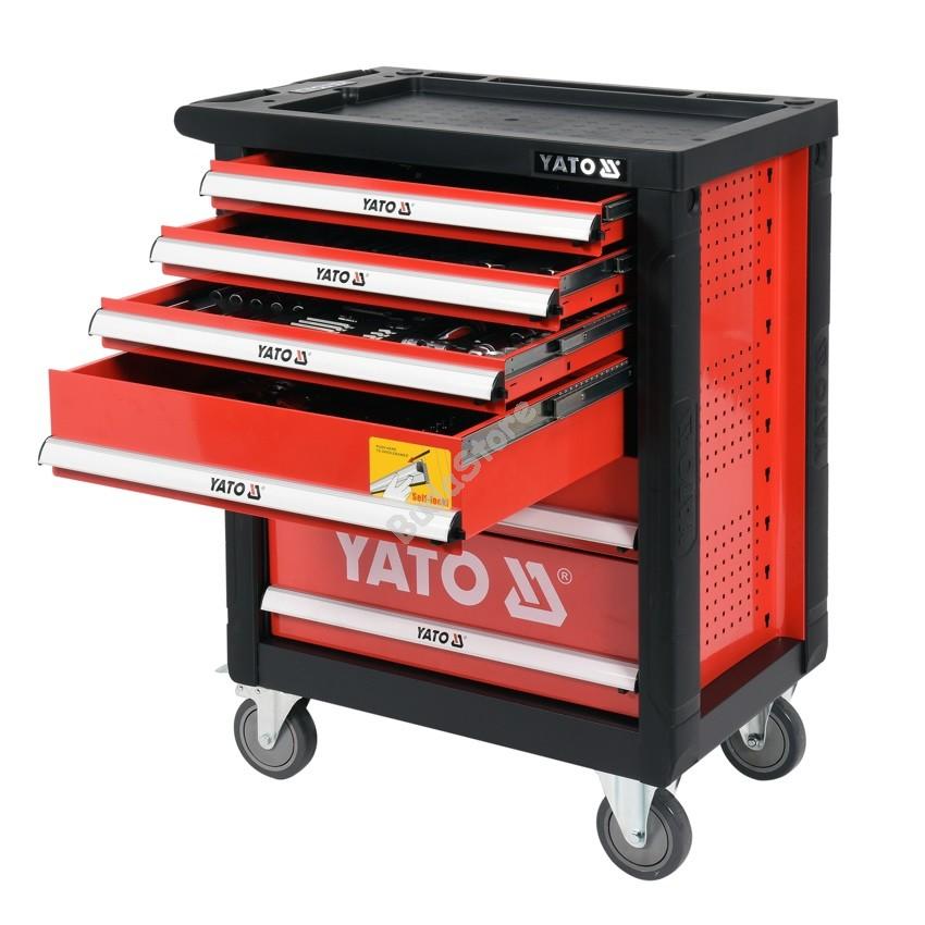 YATO Szerszámkocsi szerszámokkal 185 részes ~ - YT-55307 288 800 Ft / db [2 db 2%] [5 db 3%] [10 db 5%] Gyártó: YATO Cikkszám: S052_YT-55307 Vonalkód (EAN13): 5906083042058 Súly: 68,04 kg • 970x770x470 mm • Acéllemez profilok. • Golyóvezetős sínekkel ellátott 6 fiók. • 125 mm átmérőjű kerekek, egy fékezhető. • Dupla acéllemez fal, univerzális perforációval. • 2 kulcsos központi zárral ellátott szerszámkocsi. • 12 tálca, mely 185 db CrV ötvözetű acél szerszámot tartalmaz. • Csúszásmentes, polipropilénből készült asztallap. • A szerszámkocsi sarokvédői megakadályozzák a véletlen károsodást. Mennyiség db Nem rendelhető