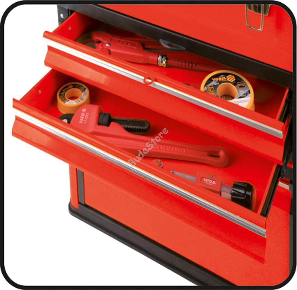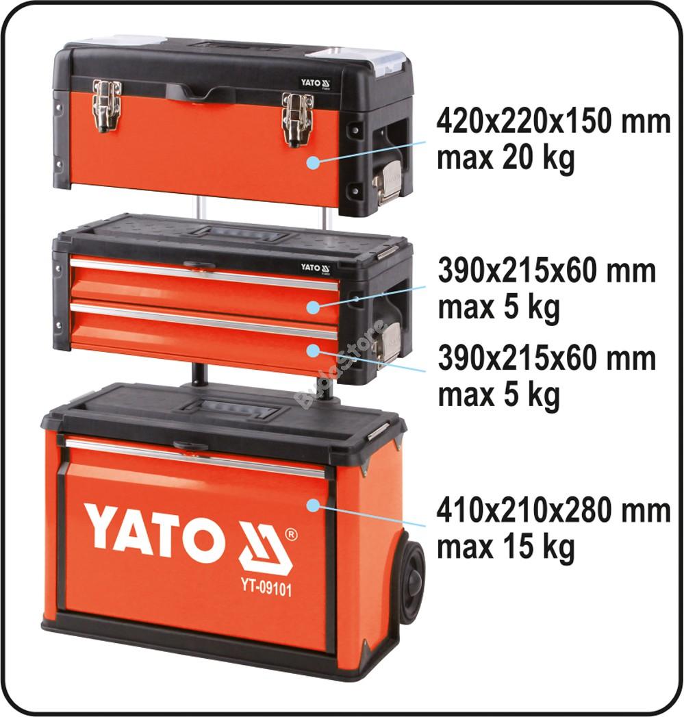 YATO Szerszámoskocsi moduláris ~ - YT-09101 75 400 Ft / db [2 db 2%] [5 db 3%] [10 db 5%] Gyártó: YATO Cikkszám: S052_YT-09101 Vonalkód (EAN13): 5906083091018 Súly: 14,40 kg Moduláris 3 részes szervizszekrényA készlet tartalmaz egy doboz aljára szerelve beépített kerekek, alumínium teleszkópos nyél és a nagy csuklós fiókotAz alsó modul teherbírása 15 kg, méret 410x210x280 mmA középső modul 2 fém fiókkal rendelkezik, amelyek kapacitása 5 kg, mérete pedig 390x215x60 mmA fiókok golyóscsapágyakkal ellátott fém vezetékekre vannak szerelveA felső modul egy klasszikus, 420x220x150 mm méretű és 20 kg teherbírású eszköztárA beépített 2 kihúzható szervező és egy szerszámtálca találhatóA modulok sík felülettel rendelkeznek, amelyet munkalapként lehet használniEzenkívül egy horony nagyon hasznos a fúrás vagy csavarozás soránEzenkívül a modulok kényelmes, csúszásmentes fogantyúval, oldalsó fogantyúkkal rendelkeznek az egyszerű emelés és csúszásmentes sarkok számáraA moduláris 3 részes lábazatot a 4 modulos készletre lehet bővíteni, az YT-09107 vagy az YT-09108 középső modul hozzáadásával Mennyiség db Kosárba tesz