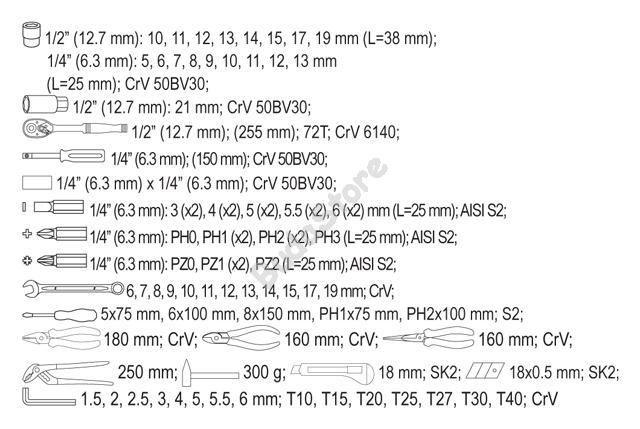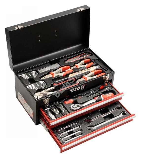 YATO Szerszámosláda szerszámokkal 80 részes ~ - YT-38951 42 590 Ft / db [2 db 2%] [5 db 3%] [10 db 5%] Gyártó: YATO Cikkszám: S052_YT-38951 Vonalkód (EAN13): 5906083389511 Súly: 10,46 kg Professzionális Szerszámkészlet 1/2" - 1/4" dugókulcsokkal és egyéb szerszámokkal Cr-Va (Chrome-Vanadium) acél ötvözet Csúszásmentes foganytúval Zárható fém szerszámosládában A szerszámosláda görgős fiókos, hordozható de akár szerszámos kocsi tetejére is tehető A szerszámjai mindig rendben lesznek, mindent megtalál egy helyen Egyéb szerszámok: Csillag-villáskulcs készlet: 6, 7, 8, 10, 11, 12, 13, 14, 15, 17, 19 mm Kézi imbuszkulcs készlet: 1.5, 2, 2.5, 3, 4, 5, 6 mm Kézi torx készlet: T10; T15; T20; T25; T27; T30; T40 Csavarhúzók (lapos): 5X75, 6X100, 8X150 mm Csavarhúzók (kereszt): PH1X75, PH2X100 mm Kombináltfogó 180 mm Oldalcsípő fogó 160 mm Hosszúcsőrű fogó 160 mm Vízpumpafogó 250 mm Kalapács 300gr Kitolható pengés vágókés (szike) + penge Mennyiség db Kosárba tesz